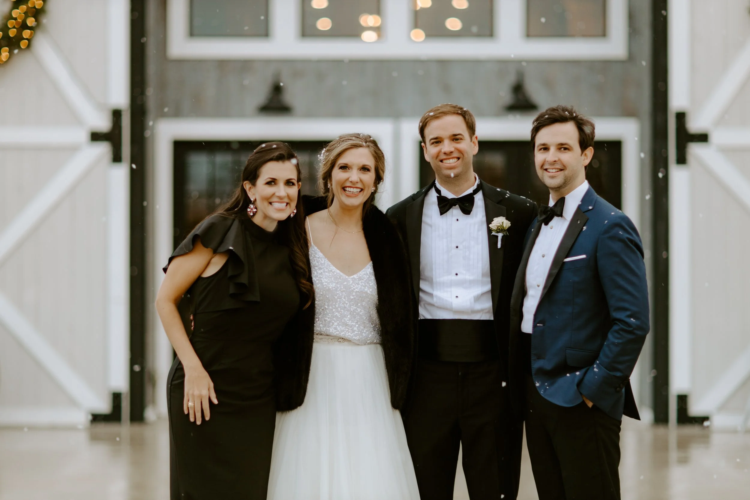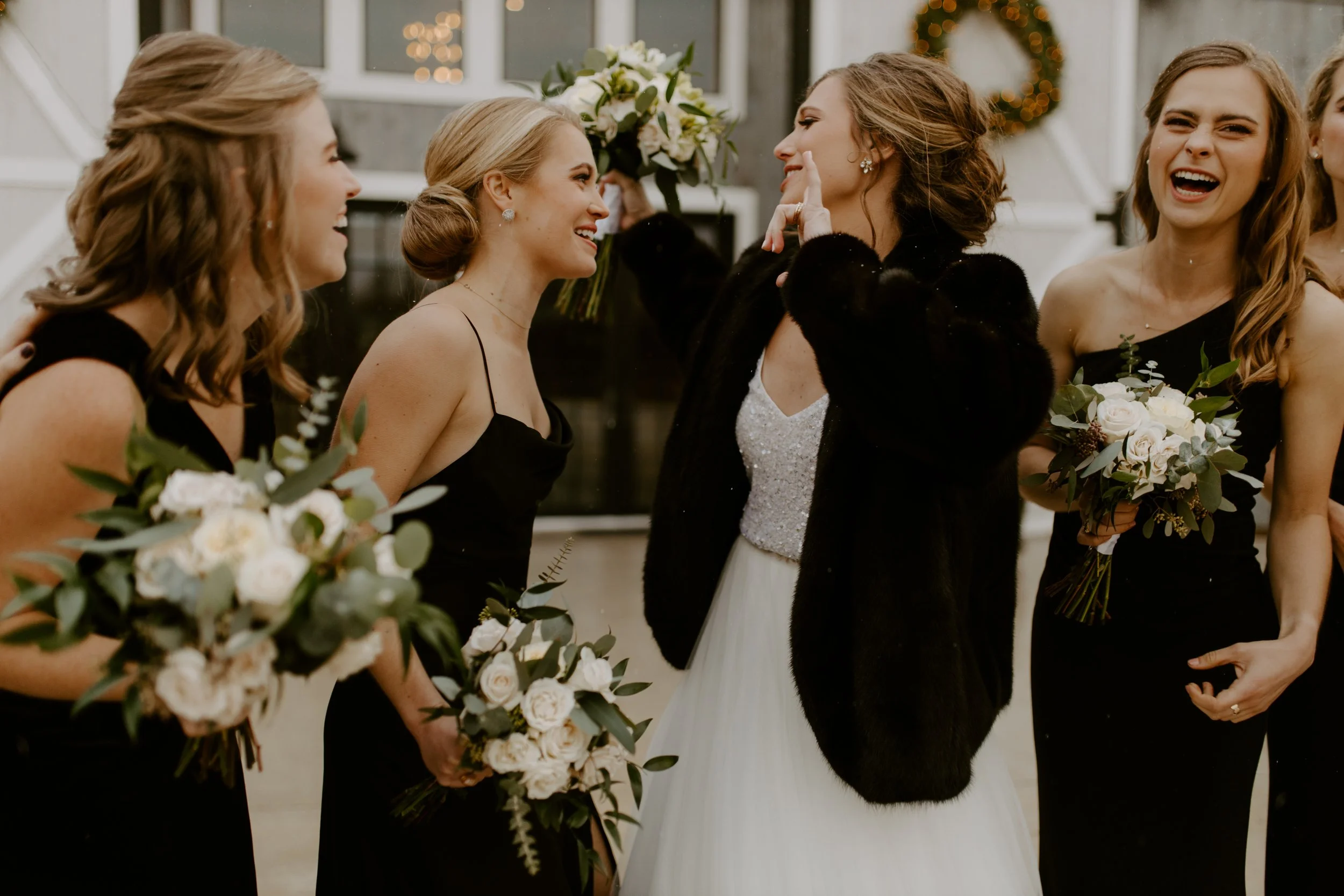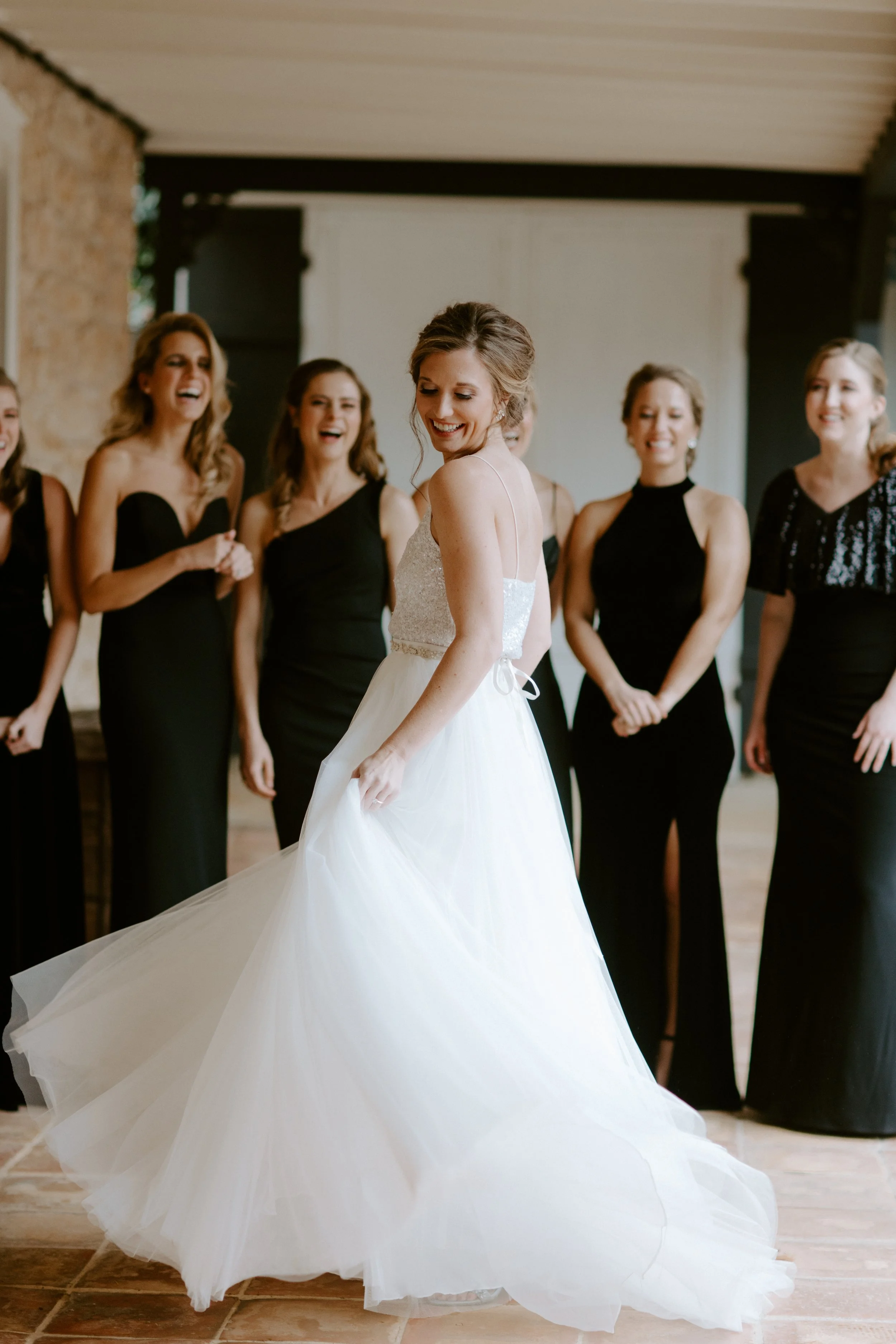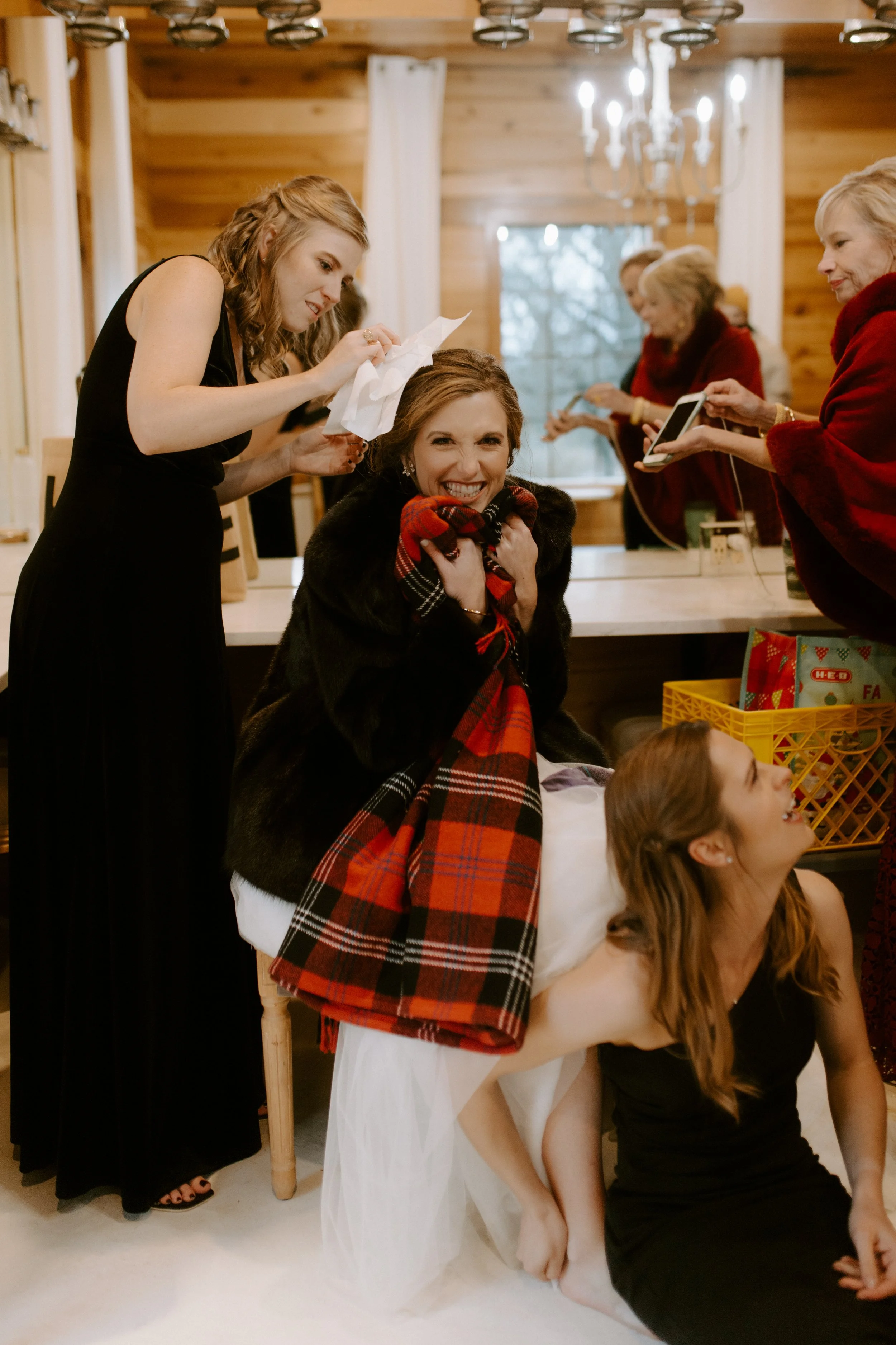 The morning brought feelings of nervous excitement! After my bridesmaids woke me up to singing “Going to the Chapel” (TOO CUTE), the girls and I bundled up for a quick drive over to Hoffman Haus where we got ready in one of the cabin suites. My bridesmaid, Ashley, had put together a “GETTING READY TO WED” playlist, so we listened to some fun tunes while enjoying mimosas and having our hair & makeup done. Because we were having a NYE wedding, our dress code was “Texas Black Tie Optional”! The boys were wearing tuxedos and I loved the idea of having my best gals in long black gowns. After doing some “long black gown” googling, I opted to have my bridesmaids pick their own black dresses (thankfully, black is an easier color to match). Gowns are expensive, so I wanted them to be able to re-wear the dresses! And GOODNESS my gals looked gorgeous!!