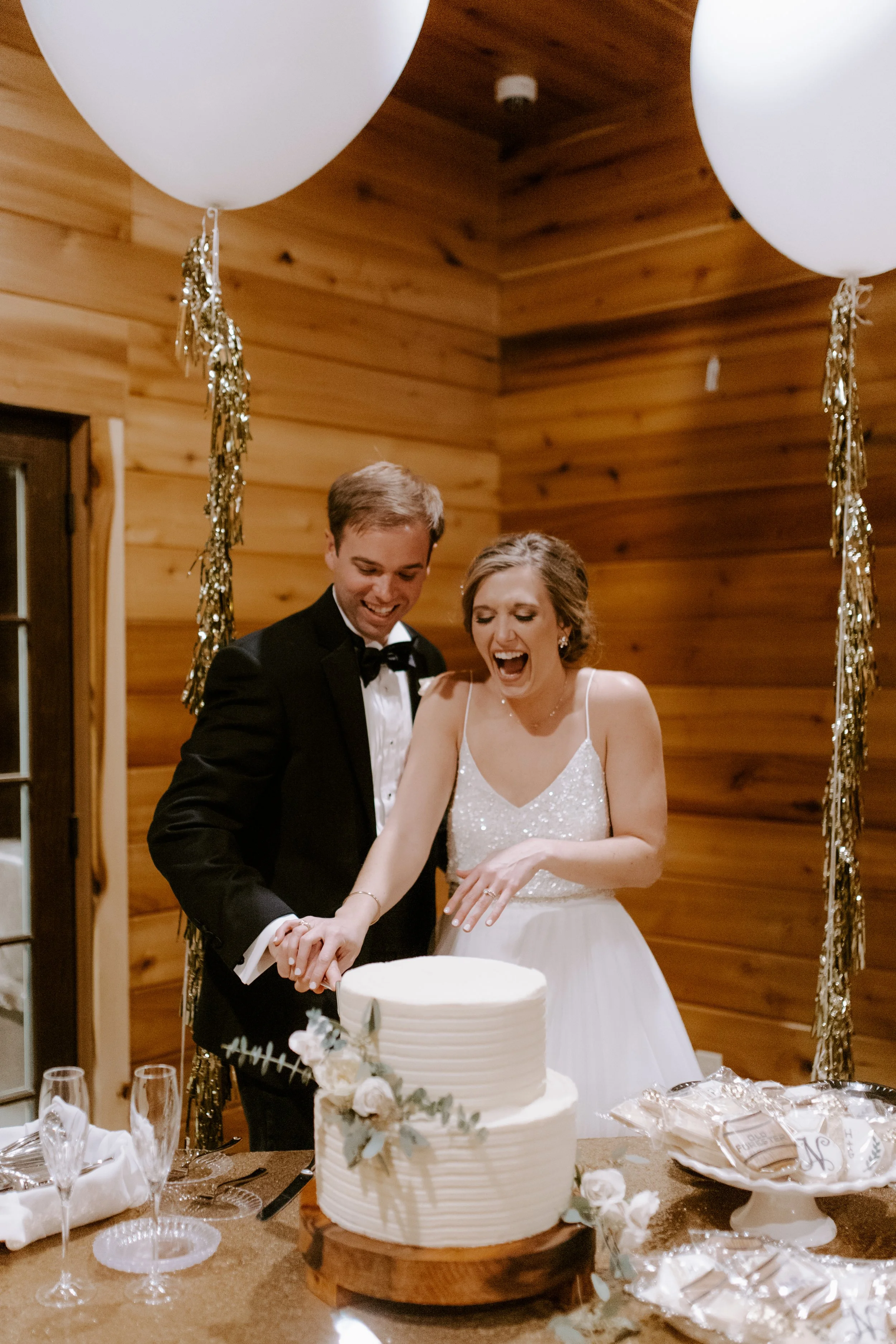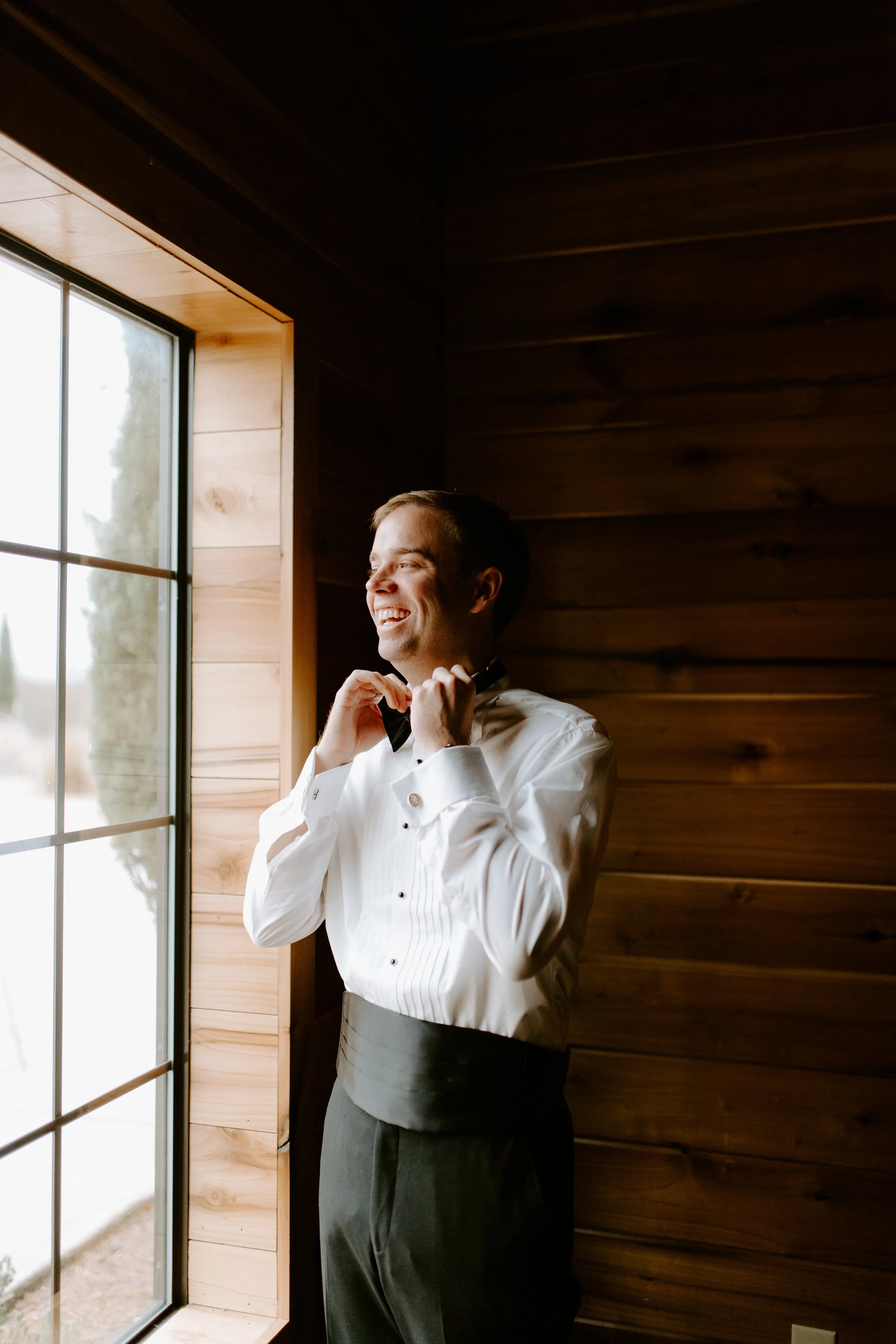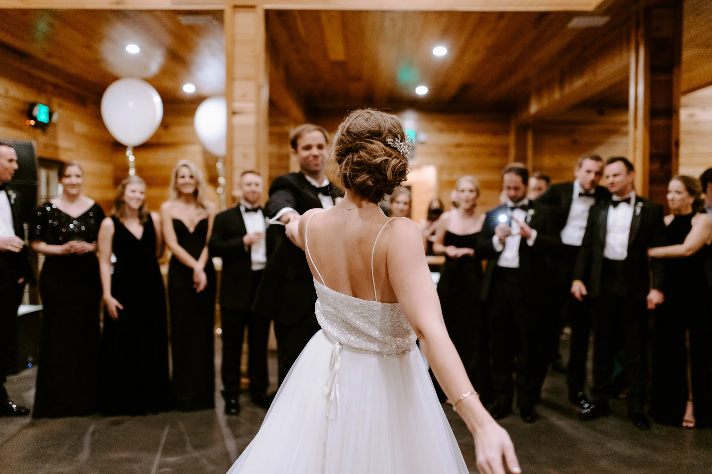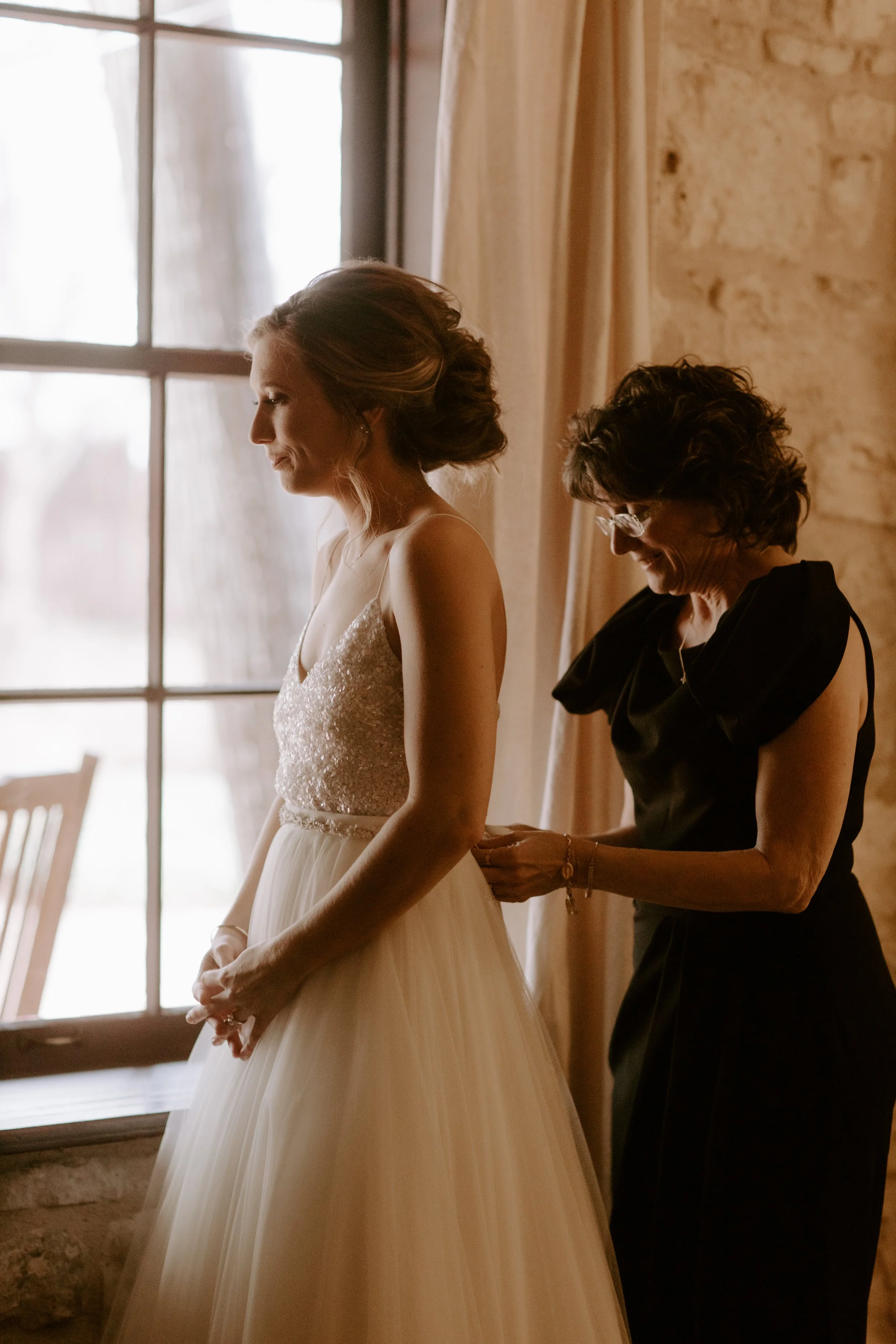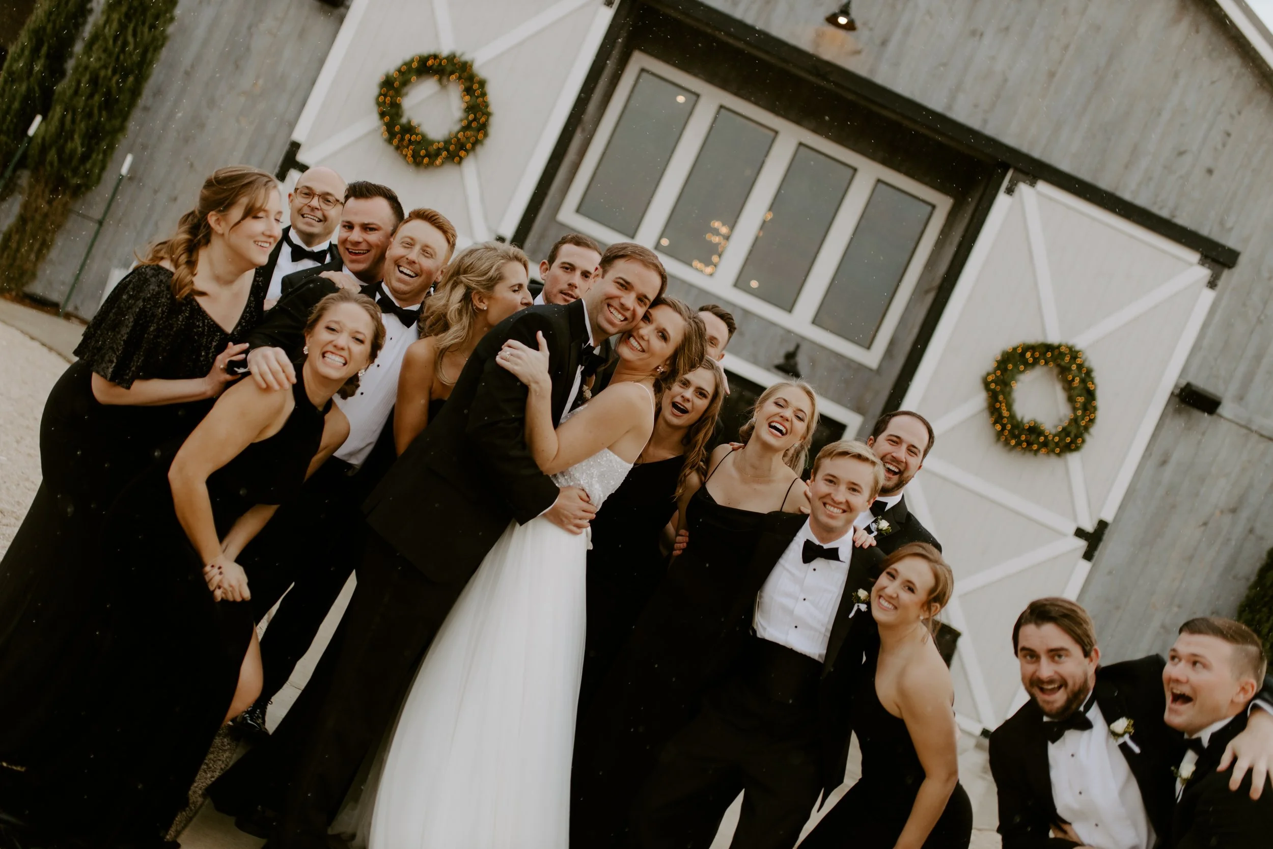 The morning brought feelings of nervous excitement! After my bridesmaids woke me up to singing “Going to the Chapel” (TOO CUTE), the girls and I bundled up for a quick drive over to Hoffman Haus where we got ready in one of the cabin suites. My bridesmaid, Ashley, had put together a “GETTING READY TO WED” playlist, so we listened to some fun tunes while enjoying mimosas and having our hair & makeup done. Because we were having a NYE wedding, our dress code was “Texas Black Tie Optional”! The boys were wearing tuxedos and I loved the idea of having my best gals in long black gowns. After doing some “long black gown” googling, I opted to have my bridesmaids pick their own black dresses (thankfully, black is an easier color to match). Gowns are expensive, so I wanted them to be able to re-wear the dresses! And GOODNESS my gals looked gorgeous!!