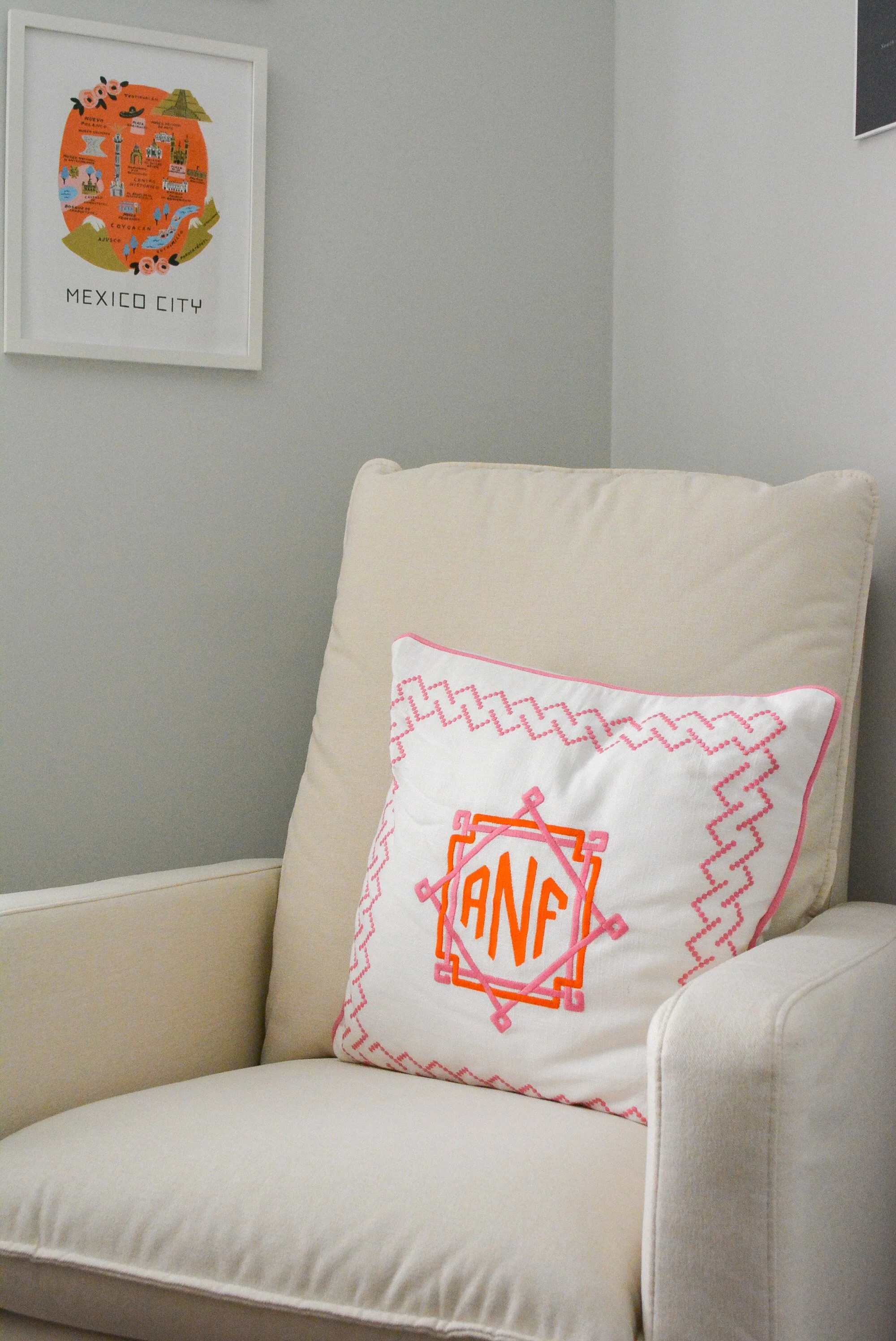 There are city prints of Rome and Mexico City from my travels abroad, framed pillow cases from our insanely memorable trip to San Miguel de Allende (George and I’s first international trip together!), vintage knitted booties hand-crafted by a family member and, of course, a map of Auburn-Opelika to represent home.